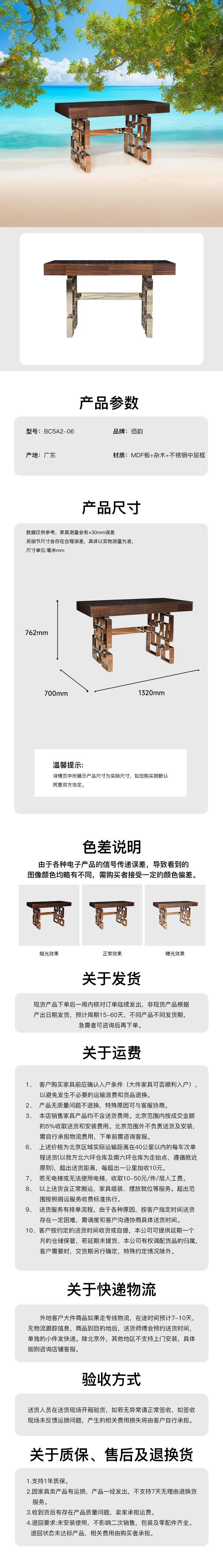 多元化风格设计运用,独特的金属造型底座,搭配木质纹路桌面,形成相互呼应浑然天成。 采用优质不锈钢材质,镀钛金涂层装饰,E1级MDF环保板材,煙熏重閃影尤加利拼花木皮薄饰面片