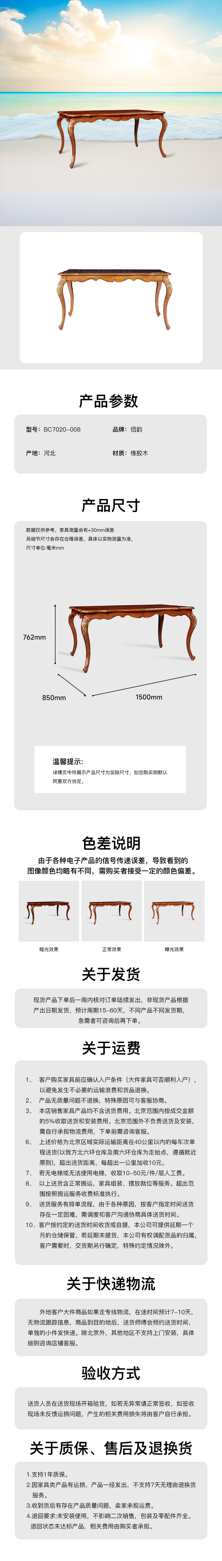 越南原装进口,曲线构造,细长S腿设计,树脂浅浮雕雕花,是洛可可法式风格的典型特征。