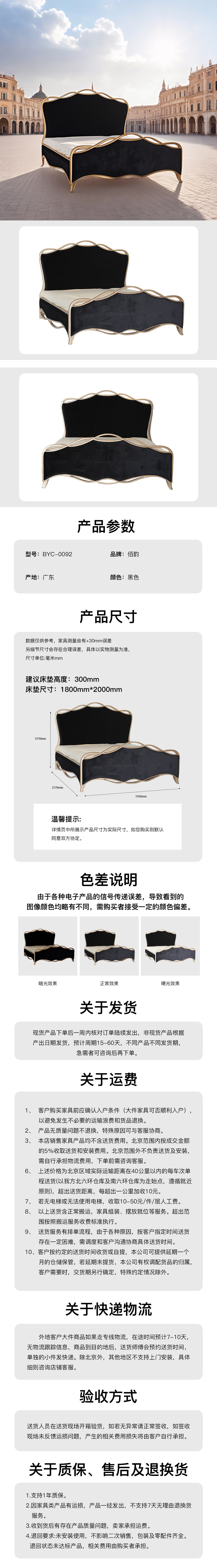 主材:主框架:黄杨木+桦木(腿) 辅料:杂木+MDF+夹板 软包:绒布+海绵(床头及床尾内外面)