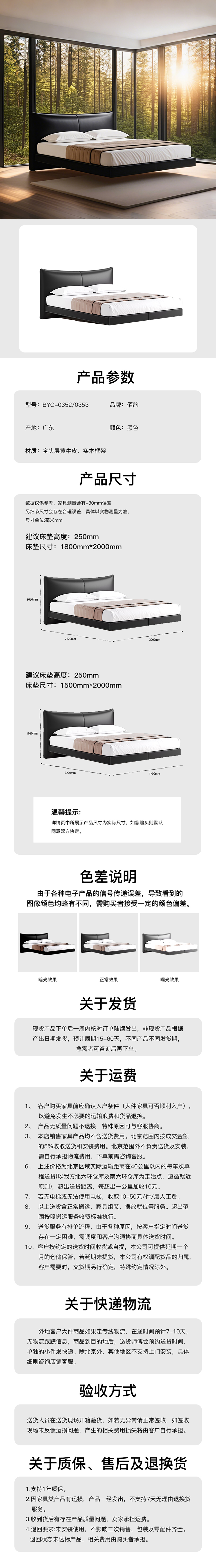 主材:面料:全头层黄牛皮骨条裁缝 材质:高密度海绵 内材:全实木框架结构,感应灯带 5D网布,超静音床架 13CM离地悬浮,3分胶脚