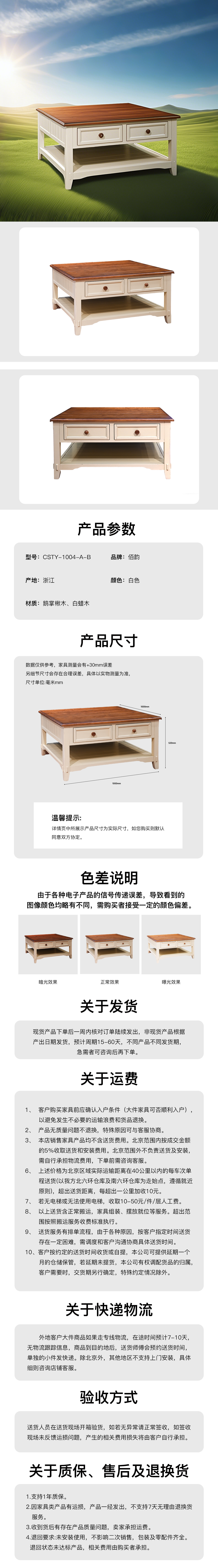 落基山正方茶几-蜜蜂色/仿古白全实木