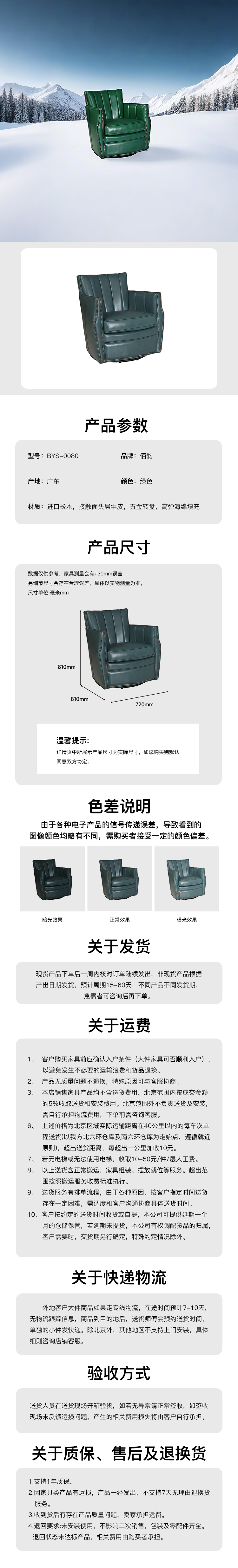 主材:木架:进口松木+E0夹板 面料:半皮 五金:五金转盘 填充物:高弹海绵