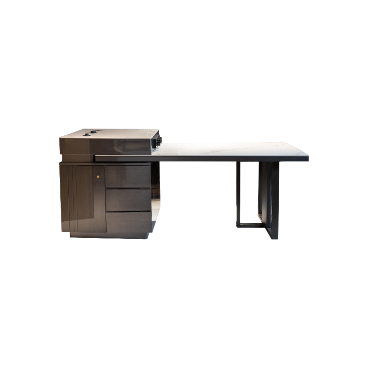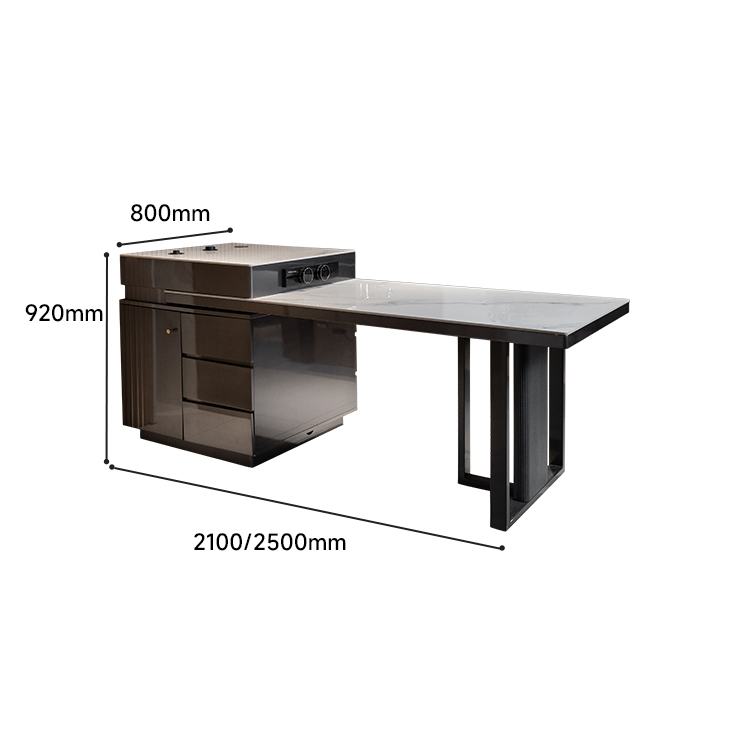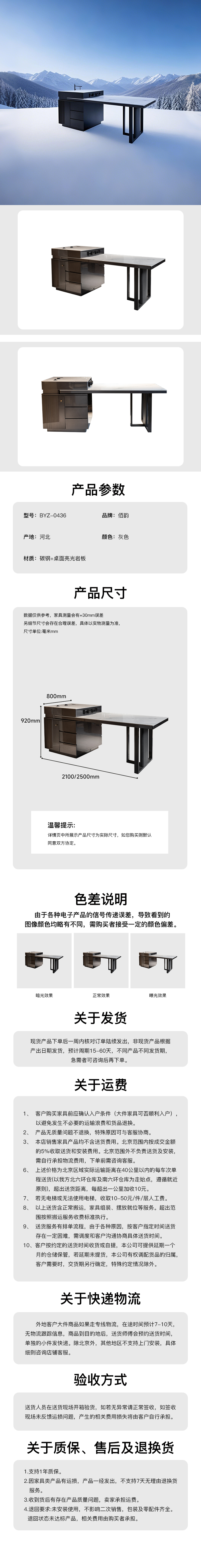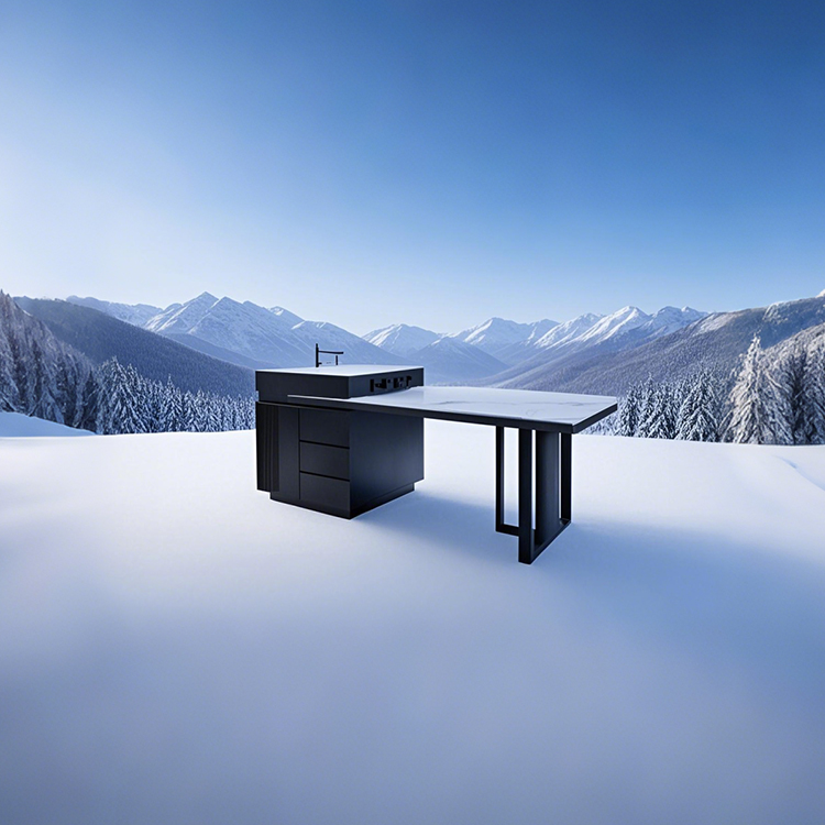 主材:实木板材+碳钢+桌面亮光岩板