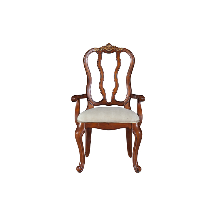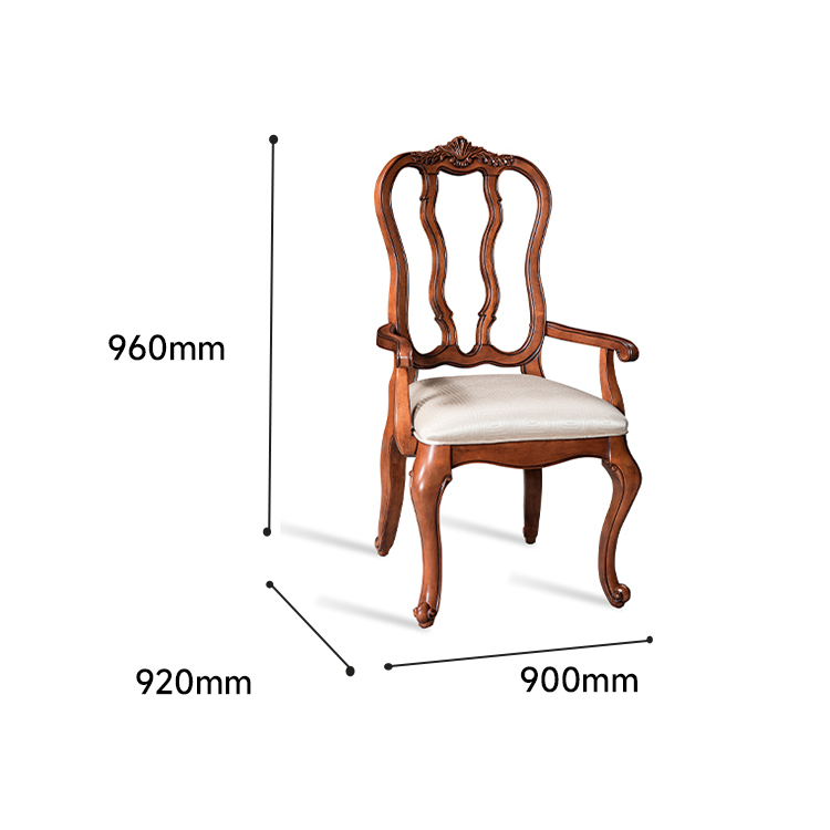此餐椅属洛可可法式风格,采用曲线构造,S腿设计。镂空的椅背增加了餐椅的通透性,符合中国人审美。 主材选用桦木实木制作,涂装选用阿克苏诺贝尔环保NC漆。